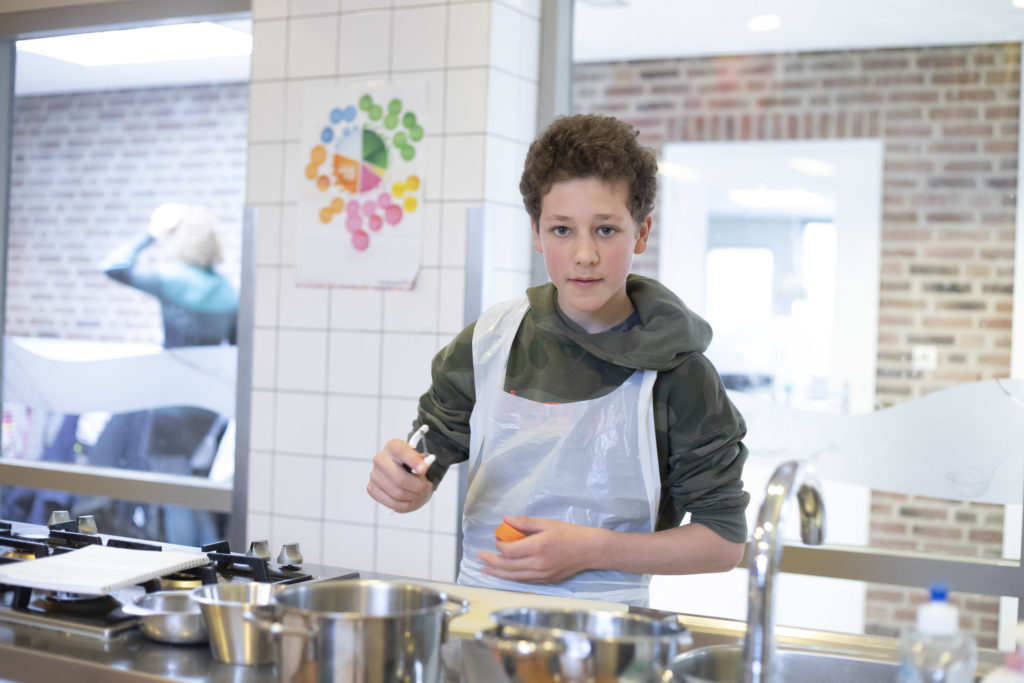 Dit vak wordt in de ‘grote keuken’ gegeven. Je leert verschillende snijtechnieken. Je maakt broodjes en soep voor de lunch. Soms verzorg je een catering met luxe broodjes en pers je sinaasappels voor de jus d’orange of je maakt lekkere hapjes voor een feestje.